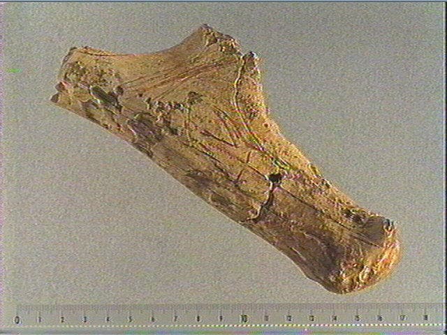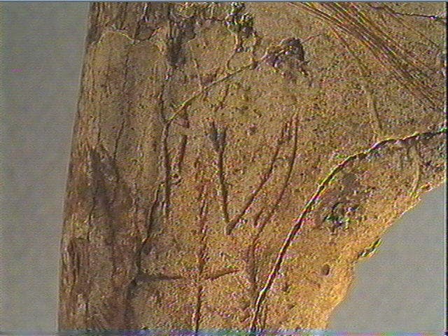 Base de la perche : animal (?) gravé, de face? Dépouille ? Hachures et rainure. Incision fine, incision en v, coloration ocre, rainurage.