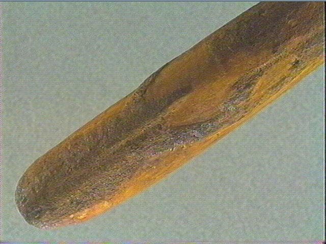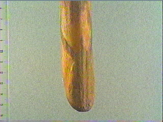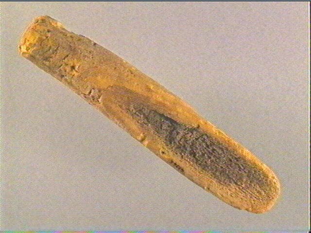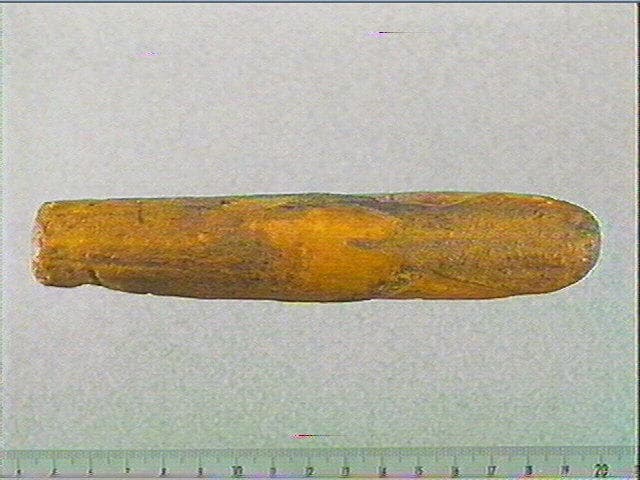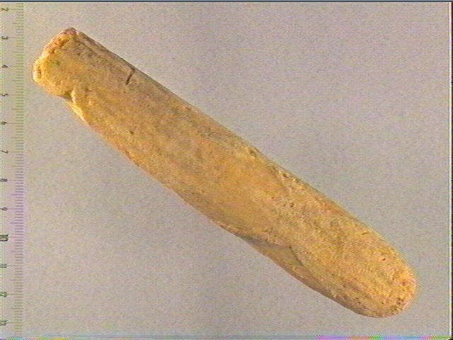 Sur la face supérieure: tête de cervidé de face, gravée en champlevé, par dégagement de la surface corticale. Les ramures se prolongent élégamment sur les côtés. Sur la face inférieure : long biseau en creux.
