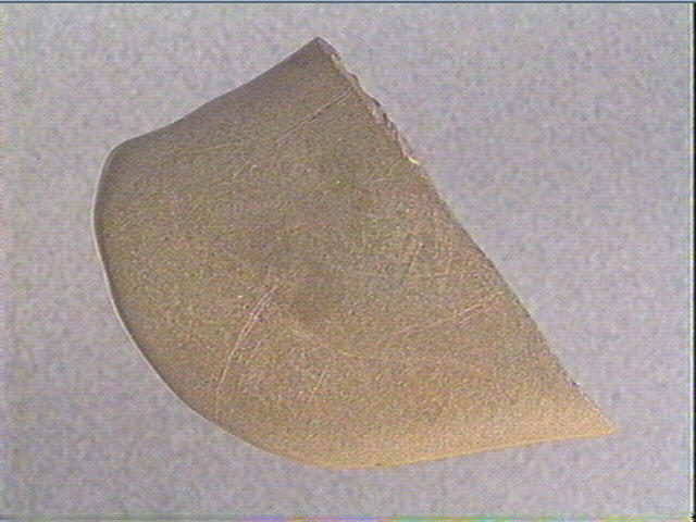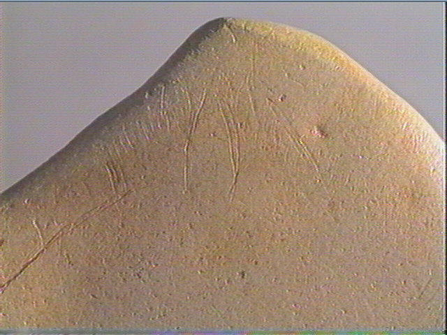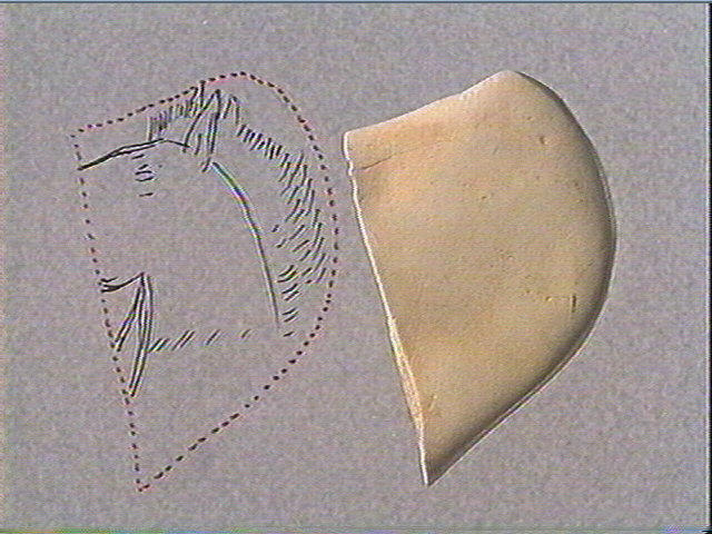 Incision fine simple, incision fine multiple. Le galet est gravé sur les deux faces. Sur une face, une tête fracturée de cheval, de profil : gauche, avec l'oreille dressée, la crinière, l'oeil, le chanfrein, l'encolure. Sur l'autre face, l'arrière-train fracturé d'un bison, avec la ligne dorsale, la queue écartée, le pelage marqué par trois lignes brisées, la patte postérieure, la patte antérieure avec le jarret bien dessiné, et la ligne ventrale. Superposé, on devine la tête d'un animal qui pourrait être un canidé, de profil : droit, avec un museau très allongé, deux oreilles pointues et dressées, et le cou.