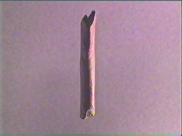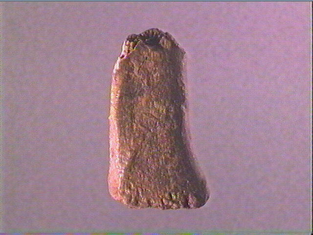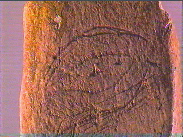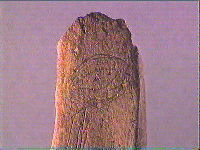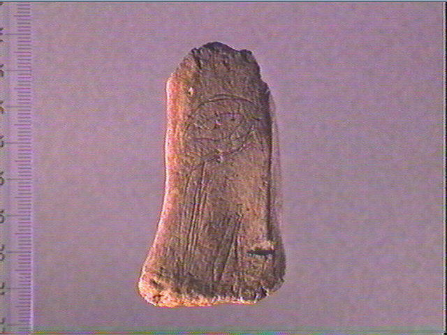 Sur une face, on observe un certain nombre d'incisions, fines ou profondes, d'apparence peu organisées dans la moitié inférieure. Plus haut, une ellipse transversale contient deux points. Elle est entourée d'une seconde, plus large et reprise, et ne permet d'envisager que d'une façon hypothétique l'évocation d'un oeil (selon Breuil) ou d'un sexe féminin