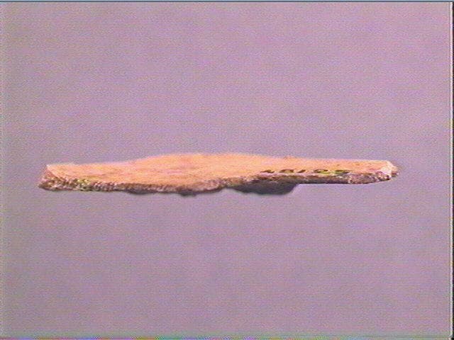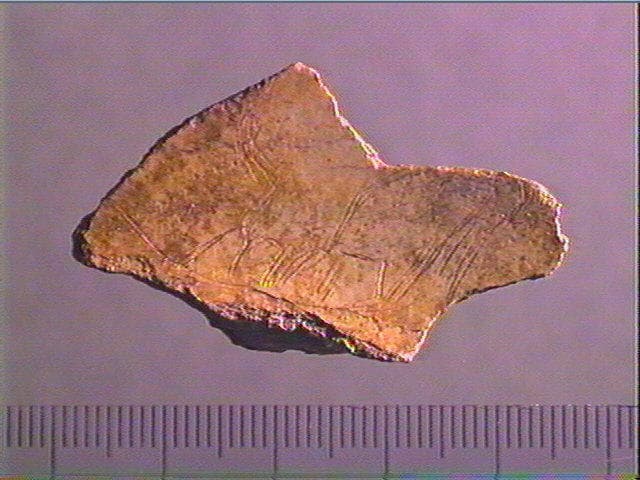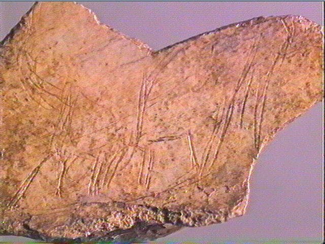 Incision fine, incision reprise, incision fine multiple. Sur une face : un mammouth de profil droit, gravé au dessus d'une ligne de sol, avec la trompe, le crâne, le poitrail, les pattes, la ligne ventrale, la queue. Sur une autre face : deux traits qui se rejoignent au bord d'une fracture