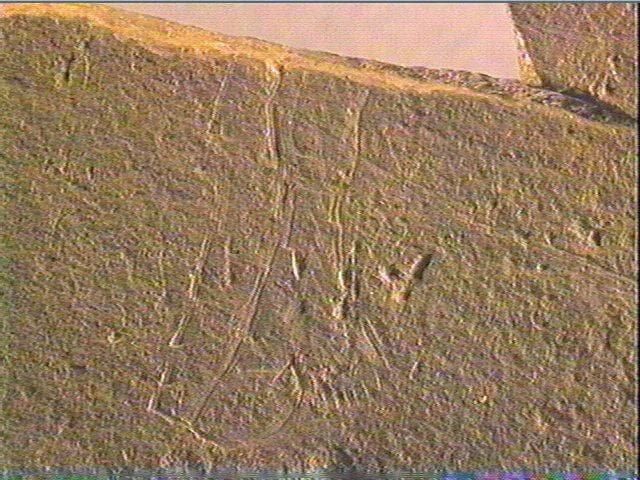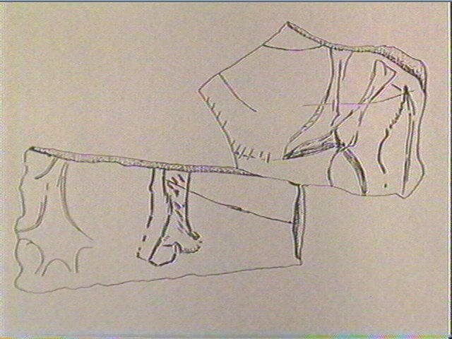 Incision fine, incision large, incision en v symétrique, incision en v dissymétrique. Deux figures animales : 1 - le cheval, de profil gauche, immédiatement lisible, deux antérieurs statiques et parallèles. Ils sont vus en perspective, le droit par un simple contour, en avant du gauche. Cet antérieur gauche est très détaillé : genou, sabot, paturon avec touffes de poils et même indications de pelage sur le genou. Après une lacune due aux cassures, on retrouve le reste de l'animal, ventre modérément ballonné, un postérieur statique, la fesse (avec figuration de pelage par petits traits) et une queue tombante. On aperçoit aussi un fragment de ligne de dos. En sens inverse, deux postérieurs dans l'attitude du pas. Le droit un peu rejeté vers l'arrière, sabot large et bisulque, le gauche en appui. La saillie du tarse est fortement marquée, la cuisse maigre. Au-delà de la cassure, à gauche, une ligne de dos appartient sans doute à ce même animal. Puis, plus à droite, une grande palme terminale de renne avec quatre andouillers aux pointes ouvertes. Nous pensons qu'il est possible d'attribuer ces différents segments (membres, ligne dorsale, ramure) à une même figure, celle d'un renne, mais sans pouvoir en apporter la preuve formelle, du moins en l'état actuel des raccords. Les membres postérieurs du renne sont postérieurs au cheval