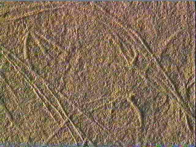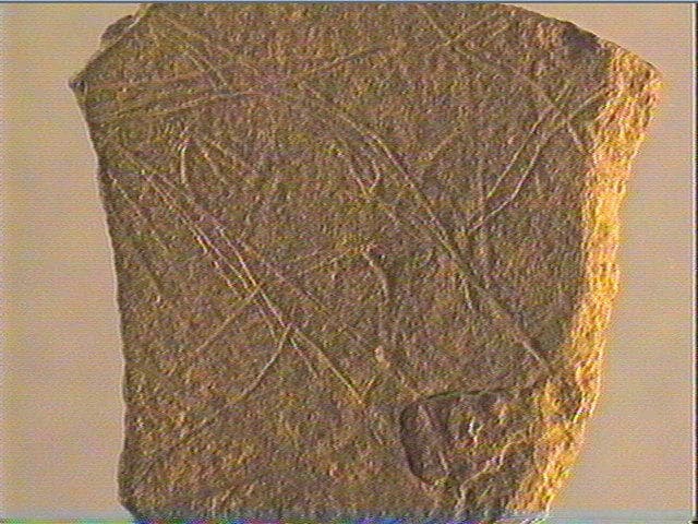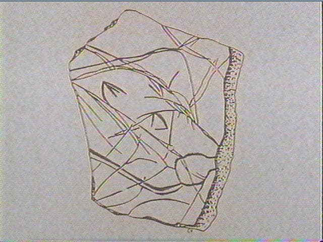 Schiste gris clair. Incision fine, incision large, incision en u, incision en v symétrique, incision dissymétrique. Parmi un enchevêtrement de traits, on distingue une tête d'animal indéterminé : - la ligne cervicale et le front sont légèrement concaves - le chanfrein est rectiligne, le tracé est en traits discontinus - l'oreille est pointue, de forme triangulaire, avec un pavillon rectiligne - l'oeil est triangulaire et ouvert - le menton a disparu et la ganache est courbe. Breuil y voyait une tête d'ours