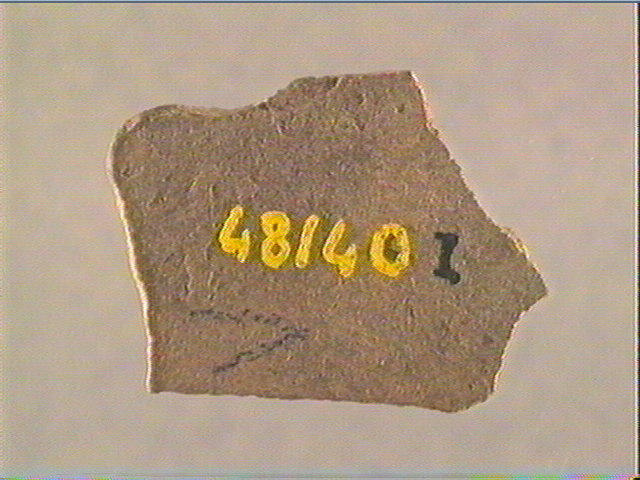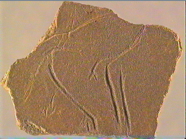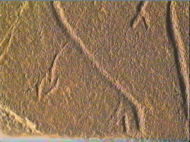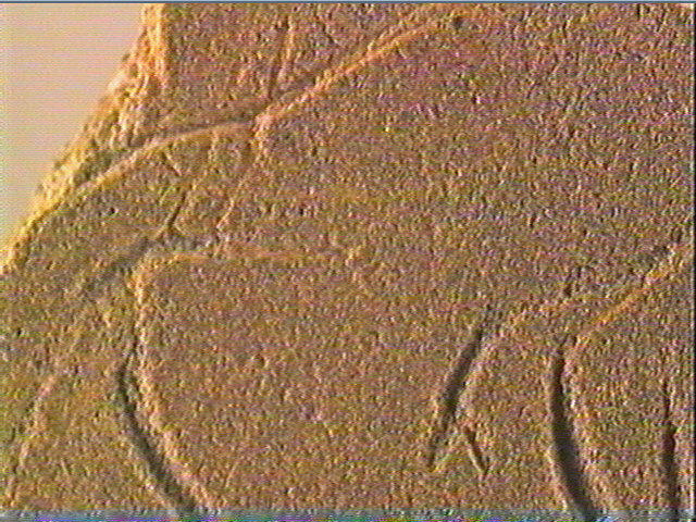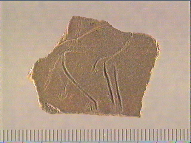 Incision profonde, incision en u, incision en v dissymétrique, incision en v symétrique. Dans la partie droite, le tracé est courbe dans la partie supérieure puis rectiligne. Un second trait double le premier sur la droite. Les tracés de gauche sont comparables. Quelques traits antérieurs aux tracés précédents sont également lisibles. L'un d'eux possède, à son extrémité, une forme bifide sur laquelle vient se poser un trait d'aspect pointu, encadré par deux points et un tiret courbe. Les gravures fines sont tous les traits antérieurs à la gravure principale. M. Chollot voit une partie d'oiseau ou un arrière-train humain