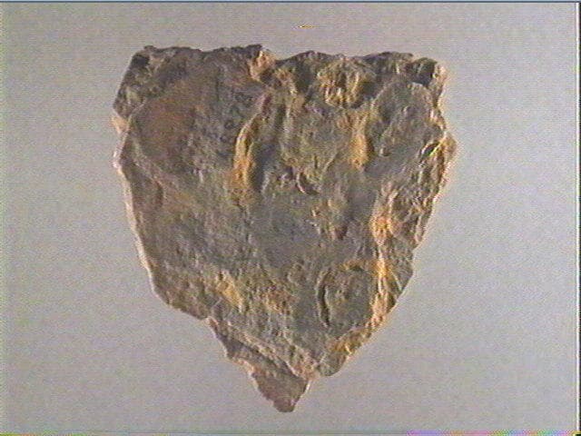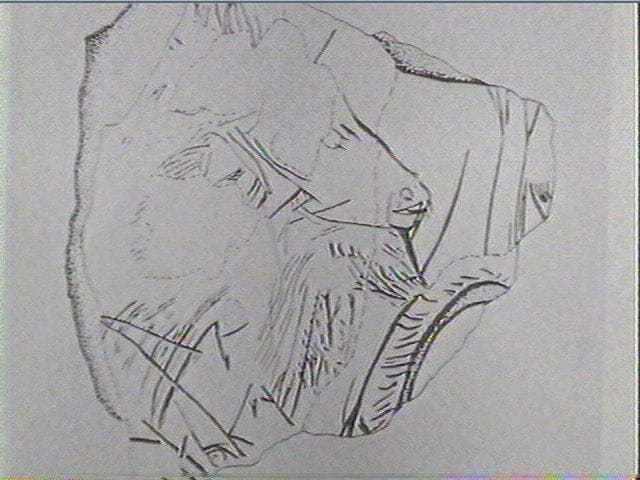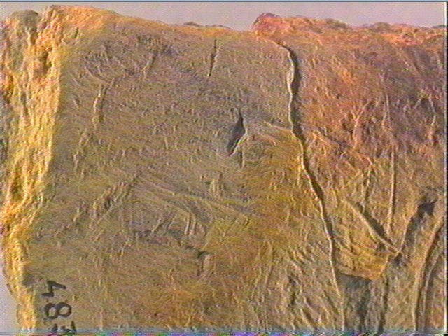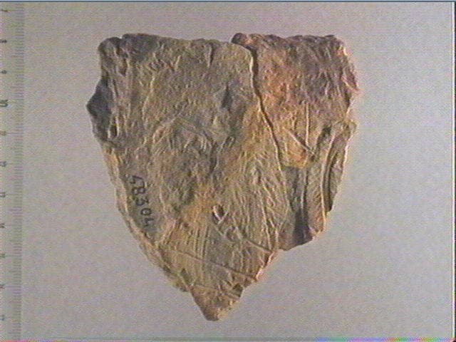 Incision fine, incision en v symétrique profonde, incision en v dissymétrique profonde. Le décor couvrant cette plaquette est constitué d'un bison de profil droit et de nombreux traits indéterminés. Le bison : prés du bord gauche, on distingue les vestiges de la crinière ; celle-ci était figurée en traits alignés verticaux ou obliques - le chanfrein est rectiligne ; la zone de la corne et de l'oreille est détruite - l'oeil est circulaire et incomplet ; deux traits horizontaux l'encadrent - l'arcade sourcilière est rendue par un trait rectiligne au-dessus de l'oeil - le museau est carré - le naseau est semi-circulaire, fermé dans sa partie inférieure par un tiret horizontal - la bouche est entr'ouverte ; on peut distinguer les incisives et peut-être la langue - la ganache est rectiligne et on distingue l'amorce de l'arc mandibulaire - un trait vigoureux dessine les limites d'une barbe triangulaire, avec un remplissage en traits obliques parallèles - on distingue l'amorce du fanon avec un remplissage assez confus de longs traits parallèles, recoupés de courtes incisions, mal conservées. Dans la partie inférieure gauche, la surface est raclée et on pourrait y discerner un oeil. Dans la partie inférieure droite, un résidu de corne avec les cernes de croissance est peut-être figuré