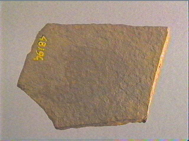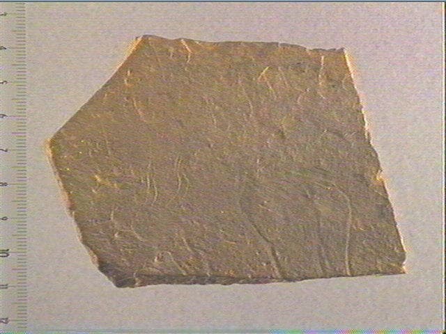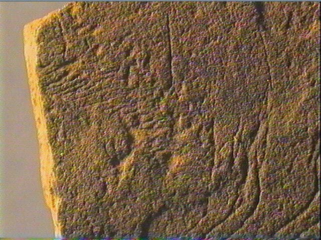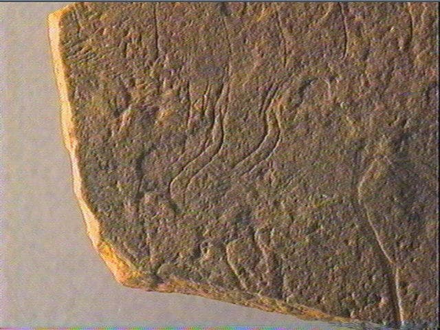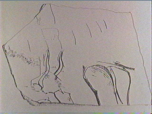 Schiste gris foncé, incision fine, incision en v symétrique profonde, incision en v dissymétrique profonde. Il ne reste que la partie supérieure d'une tête de bison et peut-être, en sens inverse, deux sabots. Le bison : - la crinière est figurée en tirets fins et obliques et un peu confus - les cornes ne sont pas tout à fait en profil absolu - le front est représenté en tirets fins et obliques - l'amorce du chanfrein est en trait rectiligne. En sens inverse du bison, devant la tête de celui-ci, peut-être une paire de sabots ou un sabot bisulque. Au-dessus de ces représentations : traits verticaux alignés