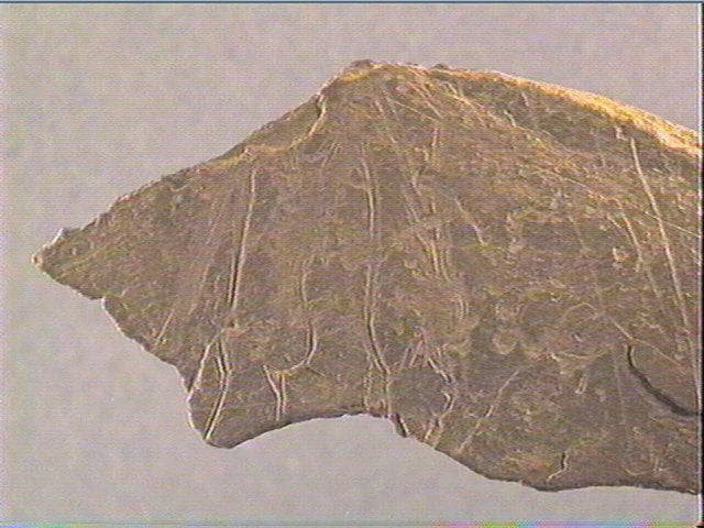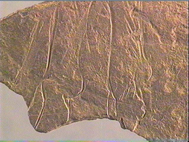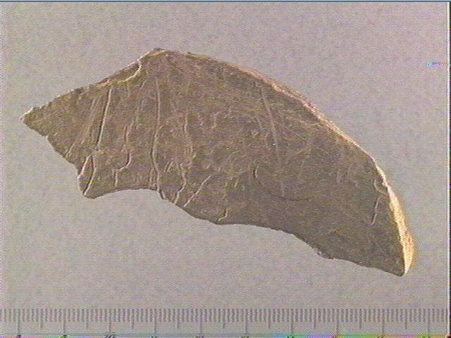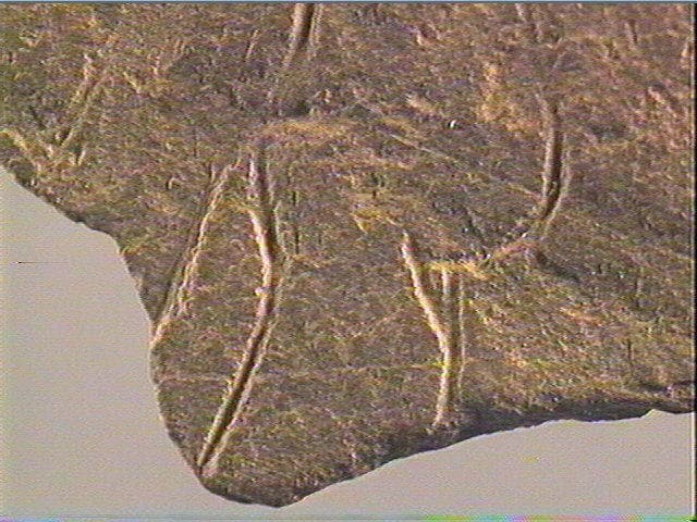 Peut-être deux pattes d'un animal de profil gauche, avec l'ergot et le sabot. Près de cette figure, d'autres traits obliques