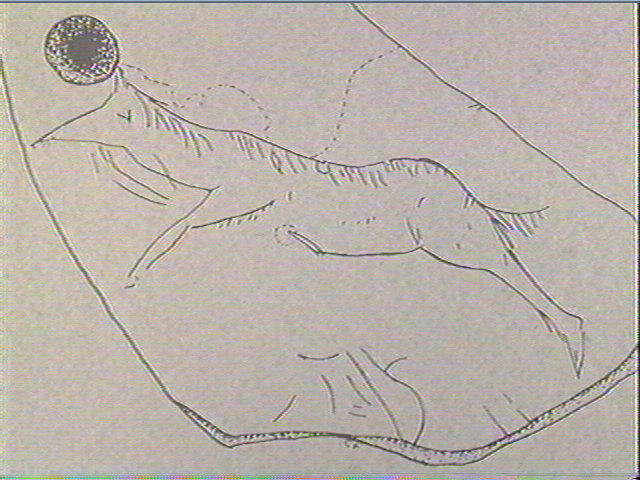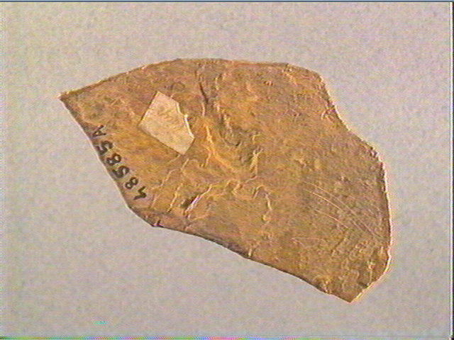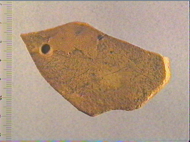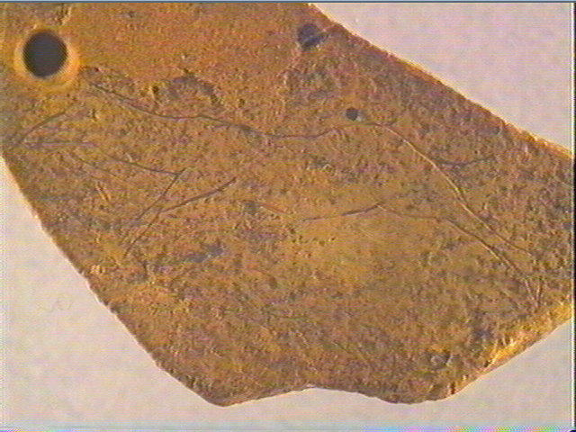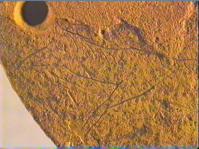 Incision en v symétrique, incision en v dissymétrique, incision fine. Canidé ou cheval gravé de profil gauche : la ligne cervico-dorsale est ondulée. Elle est soulignée sur toute sa longueur de tirets rectilignes, obliques et parallèles - l'oreille est courte, pointue et non fermée ; au-dessus de cette oreille, on observe un début de perforation - le chanfrein est concave - l'oeil est figuré par deux incisions perpendiculaires - le museau est pointu, il est le point de rencontre du chanfrein et de la ganache - la ganache est rectiligne - le membre antérieur est tendu vers l'avant et complet ; le tracé de l'épaule est, avec l'indication d'une articulation, souligné de tirets verticaux parallèles - la ligne ventrale est incomplète et légèrement courbe - le fessier est courbe, une queue y est attachée ; elle est légèrement courbe, des tirets rectilignes, obliques et parallèles la souligne - le membre postérieur est rectiligne et tendu vers l'arrière ; sa partie inférieure s'élargit bizarrement en une forme triangulaire fermée mais qui n'a rien d'un sabot. Sur cette surface, la plaquette possède une dépression. Est-ce un début de perforation ?