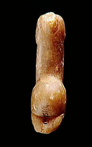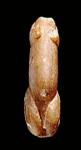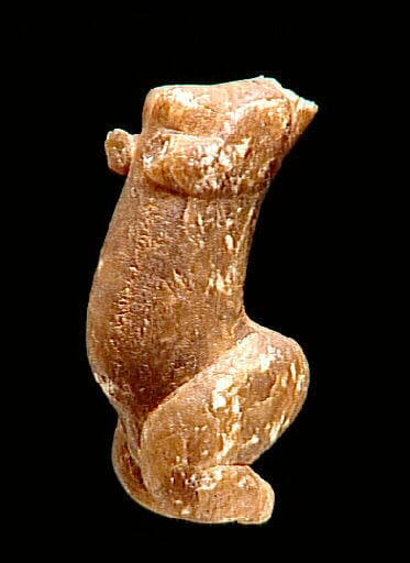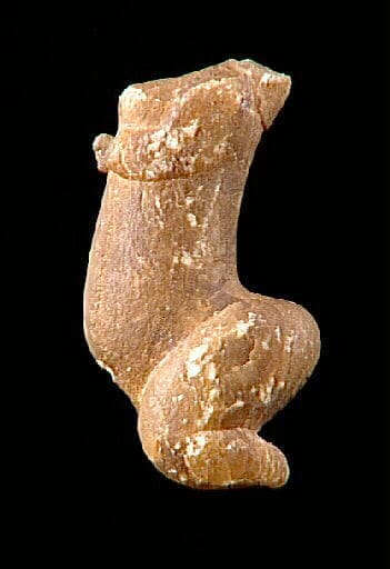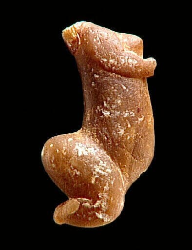Statuette trouvée dans l'ornière d'un chemin, sous la roue d'une charrette. Silex aurignaciens trouvés à 150 mètres de la statuette, dans une carrière.