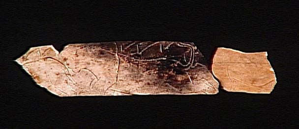 Salle Monique ; Niveau 4 ; Couche profonde ; Carré 180 ; Carré 196 Second fragment non brûlé, trouvé à environ un mètre du premier fragment