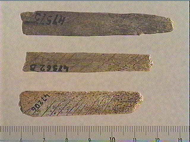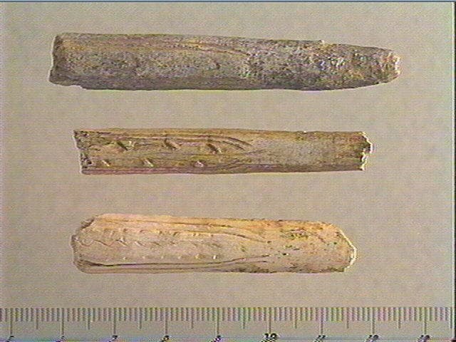 Face supérieure: 2 lignes de tubercules encadrées de 2 lignes courbes emboîtées. Face inférieure : stries obliques alignées.