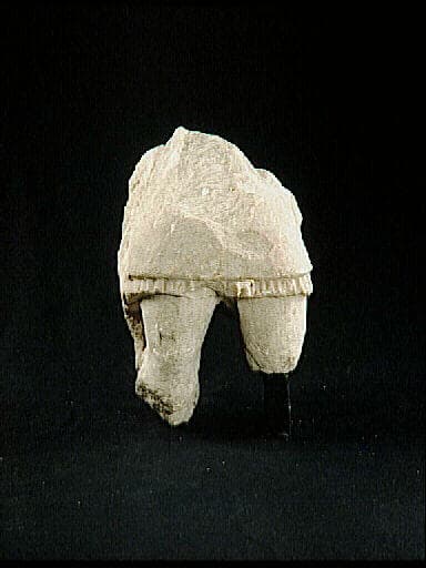 Fragment de corps de guerrier en haut relief conservé de la ceinture aux genoux. Le guerrier est de face vêtu d'une tunique courte.