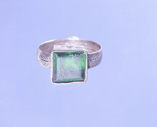 Tête carrée garnie d'une pierre en verre vert taillé en table; montée en serti clos. Anneau avec stries sur les épaules. Motif en palmette sur le bord de la bâte
