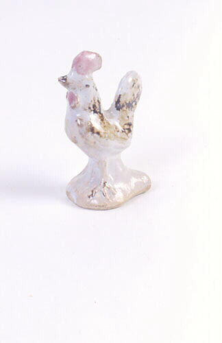 Sifflet en terre cuite vernissée, de couleur bleu pâle et rouge (crête et barbillons) plus traces brunes sur un côté, représentant un coq monté sur un socle, sans trou. Le système d'insufflation (conduit d'air aménagé) se trouve sur le socle. (type organologique, d'après la classification descriptive établie pour la collection ATP : n°432) q