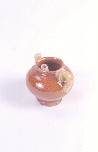 Sifflet représentant une cruche couleur ocre, avec anse supérieure (cassée) et anse latérale jaunes, sans trou. Le système d'insufflation (conduit d'air aménagé) se trouve sur un bec (comme le bec verseur d'une cruche) cassé. (type organologique, d'après la classification descriptive établie pour la collection ATP : n°432)