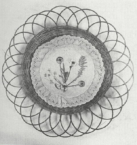 plateau circulaire. Vannerie à nappes diagonales enchevêtrées en lacerie, en moelle de rotin, départ rayonnant sur croisée, bords arrêtés renversés, texture en clair. Au centre, une composition en fleurs séchées sur fond de feutre blanc, bordé de broderie anglaise, sur vannerie