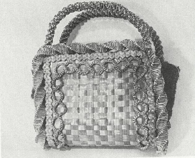 vannerie à nappes diagonales tissées toile , et à une seule nappe montée en spirale pour les décors, en paille naturelle et colorée, texture en plein. Récipient quadrangulaire plat, à deux anses supérieures longitudinales, et décor ajouté en bordure, de tresses de paille formant des spirales et des entrelacs, au centre d'une des faces, un bouquet de fleurs colorées en bleu et violet