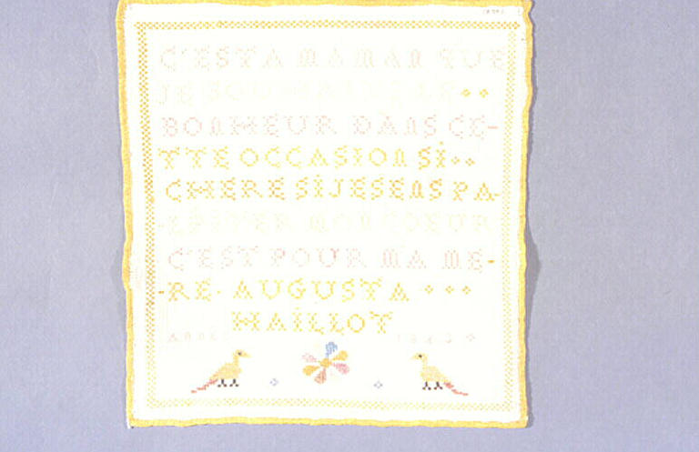 en bas, deux oiseaux de part et d'autre d'un motif floral signé Augusta Maillot ; tout autour, biais de soie jaune