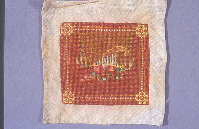 fait par écolière sur grosse toile bise ; motif central au point de croixsur fond brun et jaune