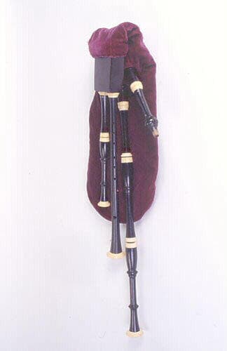 Tuyaux en faux ébène (bois peint en noir) avec viroles en os (imitation de l'ivoire) ; Réservoir en cuir recouvert d'une robe de velours violet rouge Cornemuse à bouche 1/ Réservoir en cuir recouvert d'une robe en velours violet. 2/ Tuyau mélodique en bois peint en noir avec deux viroles en os (ivoire?) à chaque extrémité, l'un faisant office de bague de protection dans la partie qui se raccorde à la souche, l'autre servant de pavillon (perce conique) ; 7 trous de jeu antérieurs, les six premiers sont répartis en deux groupes de trois, le dernier en bas est double, obturé à gauche par du liège, plus un trou de jeu postérieur situé au dessus du trou antérieur le plus haut ; 2 trous d'accord, face et dos ; le pavillon a été restauré ; Anche présente. 2+3.1/ Souche du pied se présentant comme un boîtier rectangulaire avec un décor en marquetterie sur la face antérieure, réalisé par l'incrustation de losanges et de disques en os (ivoire?). 3.1/ Petit bourdon en 2 parties, celle du bas, plus longue, présente deux moulures (au premier et deuxième tiers) ; viroles d'os (ivoire?) à chaque extrémité (soit quatre) ; L'emplacement de l'anche est bouché. 3.2/ Grand bourdon en 3 parties avec viroles d'os (ivoire?) à chaque extrémité (soit six), la dernière sert de pavillon ; présente une moulure au premier tiers sur la partie médiane et deux moulures sur celle d'en bas (cf. petit bourdon) ; Anche à vérifier. 4/ Tuyau d'insufflation en bois peint dont l'extrémité est abimé à force d'avoir été mise en bouche ; L'autre extrémité présente une virole en os (ivoire?) ; La souche présente aussi une virole en os (ivoire?)
