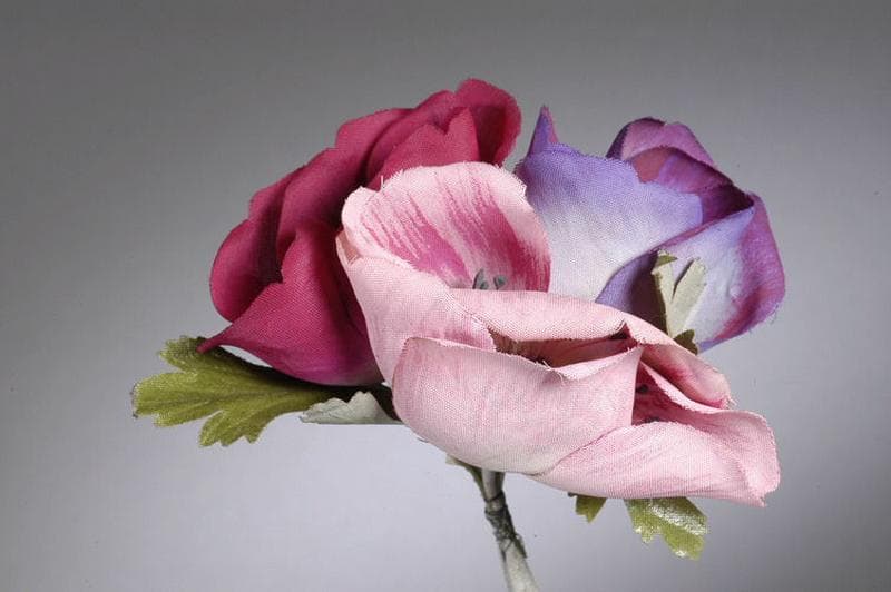 coton rose, rose, violet, coton et papier verts ; bouquet de trois fleurs de pavot de couleur rose, rose foncé et violette, avec deux feuilles