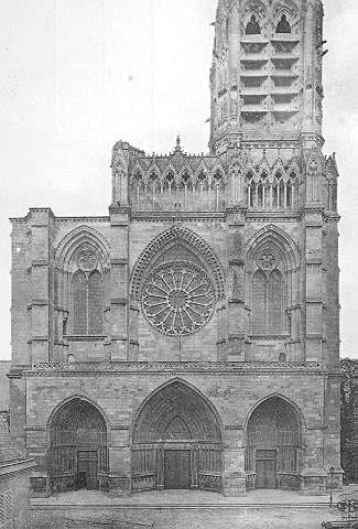 Soissons ; vue d'architecture (cathédrale, 12e siècle, style gothique, façade, portail, 13e siècle, porche, vitrail, rosace orn, tour, rue, maison)