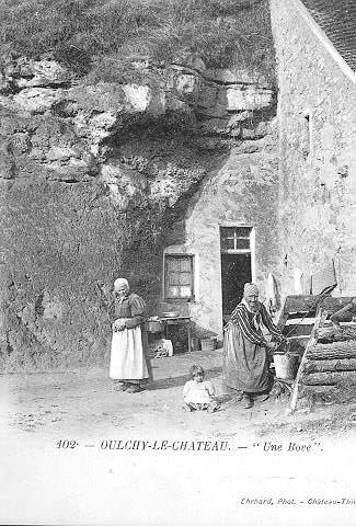 Oulchy-le-Château ; vue d'architecture (rocher, abri troglodytique, maison, puits, femme, vieille, seau, fillette, assis, table, baquet, linge de maison)