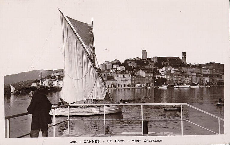 Cannes ; vue d'architecture (port, barrière, marin, debout, barbe, casquette, voilier, barque) ; fond de paysage (mont Chevalier, village, maison, arcade, tour, rempart, clocher, colline, arbre)