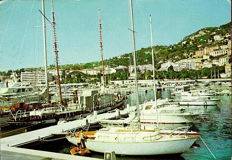 Alpes-Maritimes d ; paysage(bord de mer, port, voilier, gréement, canoë, personnage, bateau à moteur, quai, montagne, arbre, édifice d'habitation, végétation)