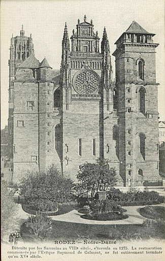 Rodez ; vue d'architecture (cathédrale, rosace orn, jardin, personnage)