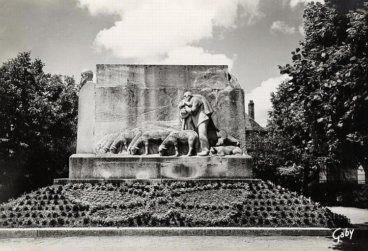 Rodez ; vue d'architecture (jardin, monument commémoratif : Fabié François, homme, en buste, barbe, bas-relief : ovidé, berger, chien) ; arbre ; maison