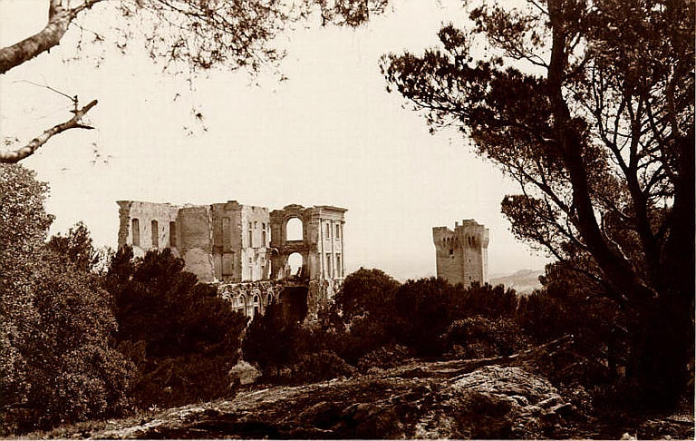 Arles ; vue d'architecture (abbaye, 12e siècle, tour, ruines, roche, bosquet)