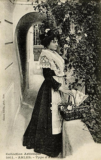Arles ; portrait (femme, de profil, en pied, costume traditionnel, tablier, coiffe, panier, fleur, éventail) ; vue d'architecture (balcon, arc, mur, plante)
