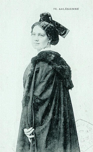 Arles ; portrait (femme, Arlésienne, de trois-quarts, debout, costume traditionnel, cape, coiffe, boucle d'oreille)
