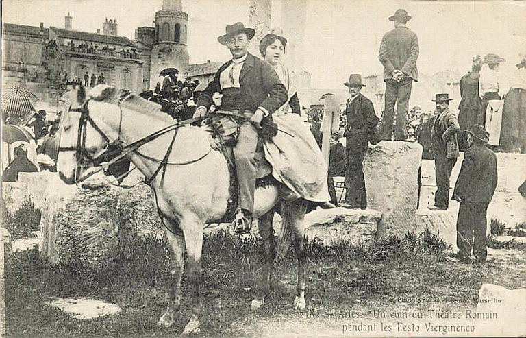 Arles ; portrait (couple, costume traditionnel, cheval, transport à dos d'animal, harnachement) ; vue d'architecture (ruines, théâtre, édifice d'habitation, balcon, tour, personnage, spectateur, ombrelle, herbe)