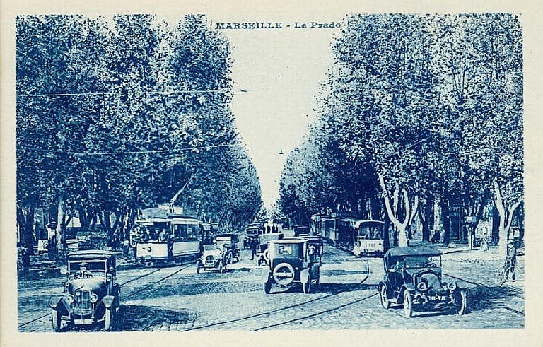 Marseille ; vue d'architecture (avenue, voie ferrée, tramway, automobile, homme, bicyclette, personnage, arbre, ombre)