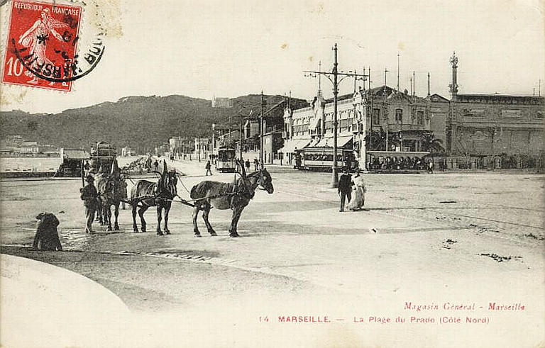 Marseille ; scène (carrefour, route, cheval, harnachement, voiture à attelage, tramway, homme, femme, bord de mer, édifice d'habitation, commerce, colline, château)