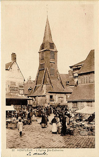 Honfleur ; vue d'architecture (clocher, horloge, maison, pan-de-bois, place, marché, étalage, marchandises, panier, personnage, affiche)