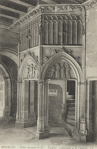 Bourges ; vue d'architecture (palais, 15e siècle, style gothique, intérieur, escalier, bas-relief)