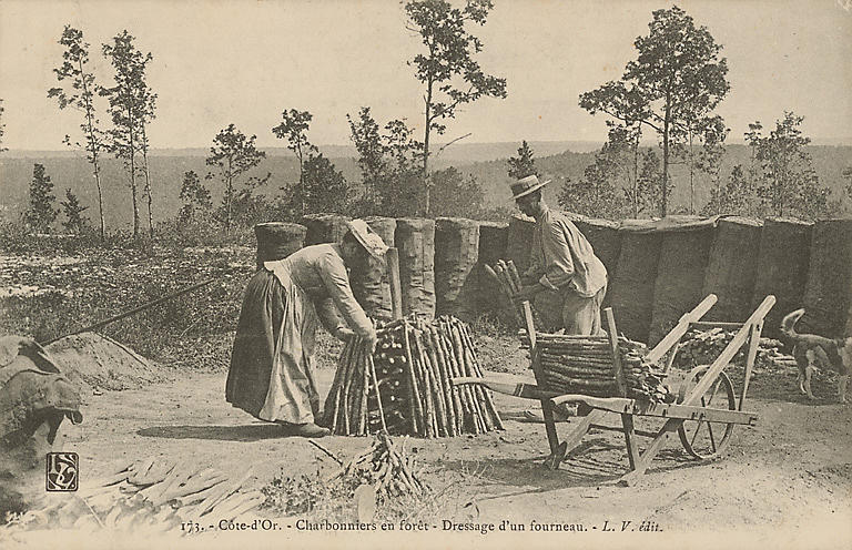 Côte-d'Or d ; scène (charbonnier, homme, femme, chapeau, tablier, brouette, bois mort, sac, construction, fourneau, chien, ombre, arbre)