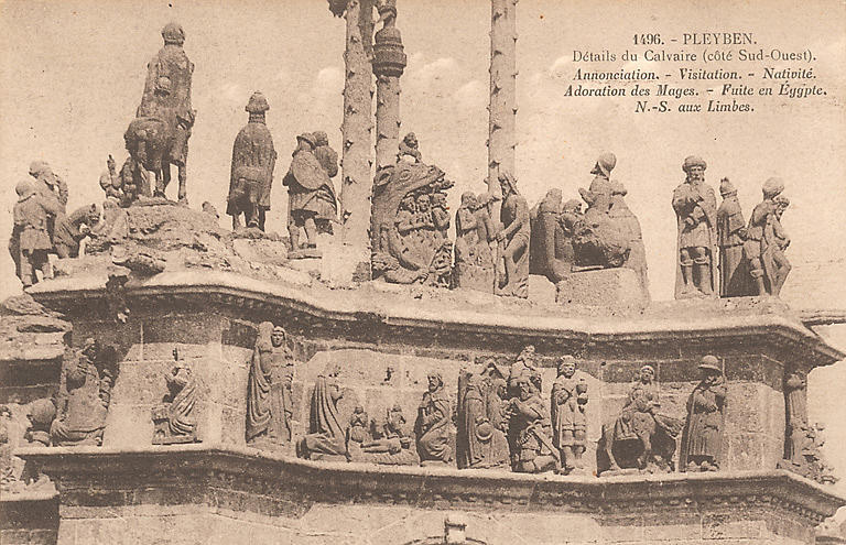 Pleyben ; vue d'architecture (calvaire monumental, 17e siècle, statue, cavalier, soldat, bas-relief) ; scène biblique (Résurrection des morts) ; scène biblique (Enfer, Damné, Léviathan, diable, flamme) ; scène biblique (Annonciation) ; scène biblique (Visitation) ; scène biblique (Nativité) ; scène biblique (Adoration des Mages) ; scène biblique (Fuite en Egypte)