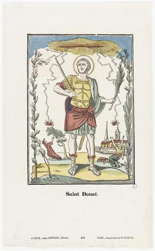 figure (saint Donat de Münstereifel, soldat : Antiquité : Romain, épée, gerbe) ; église ; personnage ; peur ; foudre