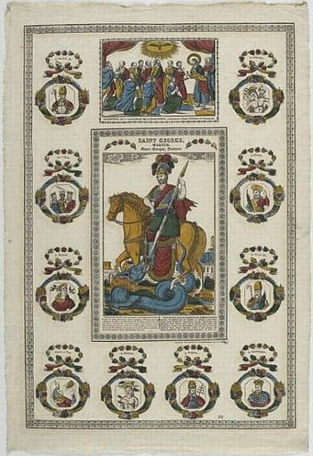 INSTITUTION DU S. SACREMENT DE L'EUCHARISTIE (titre inscrit, français, allemand, gothique) ; SAINT GEORGE, / MARTYR. (titre inscrit, français, allemand, gothique)