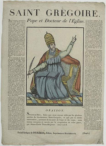 Imprimerie de DECKHERR, à Montbéliard. (Doubs.) (b.) ; SAINT GREGOIRE, surnomé le / Grand (...) afin que nous ayons le bonheur / d'être de vos brebis bien-aimées. (g. d.) ; ORAISON. / SEIGNEUR Dieu, faites que nous soyons aidés (...) Ainsi soit-il. (b. m.) ; M. & O. CLAUDE (b. d., revers, encre violette)