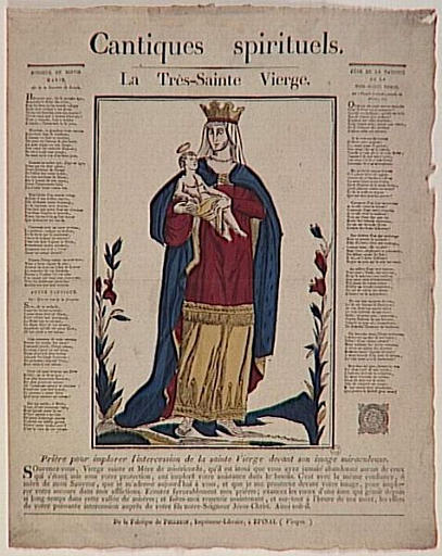 De la Fabrique de PELLERIN, Imprimeur-Libraire, à Epinal (Vosges.) (b. m.) ; BONHEUR DE SERVIR / MARIE. / Air de la Romance de Joseph. (h. g.) / HEureux (. . .) enfants (b. g.) / FETE DE LA NATIVITE / DE LA / TRES-SAINTE VIERGE. / Air : Peuple français, peuple de / frères, etc. (h. d.) / QUELLE (. . .) pour nous? (b. d.) / Prière (. . .). Ainsi soit-il. (b. m.)