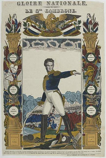 portrait (Cambronne Pierre Jacques Etienne, en pied, uniforme, sabre, combat, infanterie, blessé, bataille : Waterloo B) ; ornementation (en encadrement, colonne, trophée de guerre, couronne : laurier, femme, allégorie : victoire, aigle, drapeau (Français))