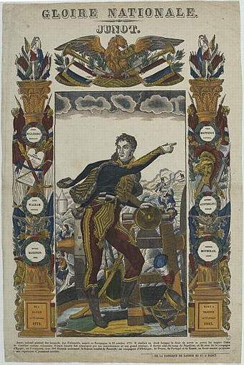 portrait (Junot Andoche, en pied, désigner, officier, général, uniforme, canon, infanterie, assaut, sabre, fusil, baïonnette, nuée) ; ornementation (en encadrement, colonne, couronne : laurier, casque : antiquité Romaine ; aigle, drapeau, allégorie : victoire, aigle, drapeau (Français))