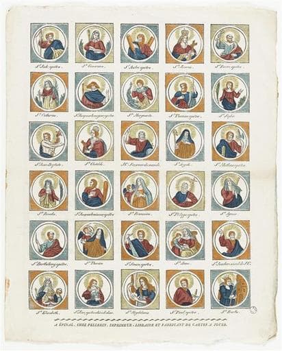 a1 ; figure biblique (en médaillon, en buste, saint Jude, rayons lumineux) ; b1 ; figure biblique (en médaillon, en buste, sainte Geneviève de Paris, rayons lumineux) ; c1 ; figure biblique (en médaillon, en buste, rayons lumineux, saint André) ; d1 ; figure biblique (en médaillon, en buste, rayons lumineux, sainte Jeanne de France, couronne, crucifix) ; e1 ; figure biblique (en médaillon, en buste, rayons lumineux, saint Pierre) ; a2 ; figure biblique (en médaillon, en buste, rayons lumineux, sainte Catherine d'Alexandrie, épée) ; b2 ; figure biblique (en médaillon, en buste, rayons lumineux, saint Jacques le Majeur) ; c2 ; figure biblique (en médaillon, en buste, rayons lumineux, sainte Marguerite d'Antioche, dragon) ; d2 ; figure biblique (en médaillon, en buste, rayons lumineux, saint Thomas) ; e2 ; figure biblique (en médaillon, en buste, rayons lumineux, sainte Sophie) ; a3 ; figure biblique (en médaillon, en buste, rayons lumineux, saint Jean-Baptiste) ; b3 ; figure biblique (en médaillon, en buste, rayons lumineux, sainte Clotilde) ; c3 ; figure biblique (en médaillon, en buste, rayons lumineux, Christ glorieux) ; d3 ; figure biblique (en médaillon, en buste, rayons lumineux, sainte Angèle Merici de Brescia) ; e3 ; figure biblique (en médaillon, en buste, rayons lumineux, saint Matthias) ; a4 ; figure biblique (en médaillon, en buste, rayons lumineux, sainte Rosalie de Palerme) ; b4 ; figure biblique (en médaillon, en buste, rayons lumineux, saint Jacques le Mineur) ; c4 ; figure biblique (en médaillon, en buste, rayons lumineux, sainte Françoise romaine) ; d4 ; figure biblique (en médaillon, en buste, rayons lumineux, saint Philippe) ; e4 ; figure biblique (en médaillon, en buste, rayons lumineux, sainte Agnès de Rome) ; a5 ; figure biblique (en médaillon, en buste, rayons lumineux, saint Barthélémy) ; b5 ; figure biblique (en médaillon, en buste, rayons lumineux, sainte Thérèse d'Avila) ; c5 ; figure biblique (en médaillon, en buste, rayons lumineux, saint Simon) ; d5 ; figure biblique (en médaillon, en buste, rayons lumineux, sainte Anne) ; e5 ; figure biblique (en médaillon, en buste, rayons lumineux, saint Joachim) ; a6 ; figure biblique (en médaillon, en buste, rayons lumineux, sainte Elisabeth) ; b6 ; figure biblique (en médaillon, en buste, rayons lumineux, saint Jean) ; c6 ; figure biblique (en médaillon, en buste, rayons lumineux, sainte Madeleine) ; d6 ; figure biblique (en médaillon, en buste, rayons lumineux, saint Paul de Tarse) ; e6 ; figure biblique (en médaillon, en buste, rayons lumineux, sainte Barbe)
