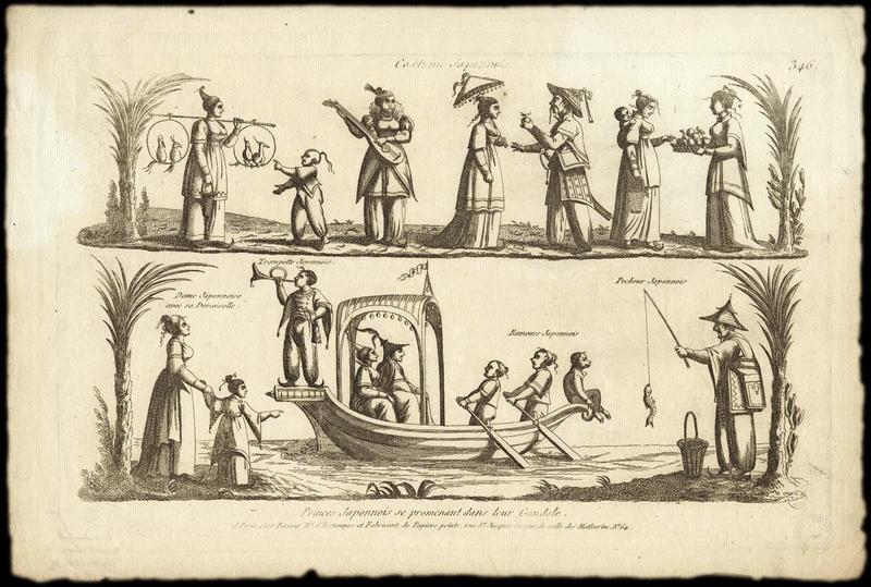 346. (h. d.) ; A Paris chez Basset Md d'Estampes et Fabricant de Papiers peints, rue St Jacques au coin de celle des Mathurins N°64. (b. m.) ; Costumes japonais (h. m.) ; Dame japonaise avec sa demoiselle (b. g.) [...] Pecheur Japonnais (b. d.)