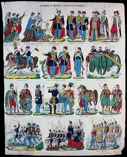 suite de scènes (cycle thématique, Guerre de Crimée, femme, jeune homme, bijou : don, chef d'état de Turquie : Abd-el-Medjid Ier, soldat : Turquie, homme : richesse, cavalier : Turquie, char, cheval, canon, général : France, général : Angleterre, général : Turquie, esclave, Noir, soldat : Albanie, soldat : Français, soldat : Anglais)